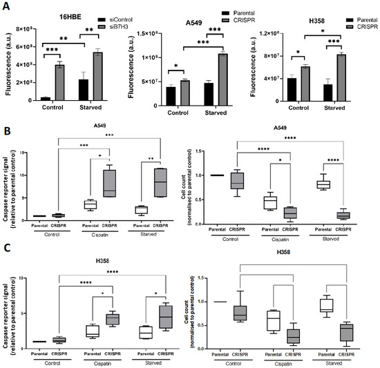 Some chemotherapeutic agents induce oxidative stress to drive cancer cell death. Increasing ROS production or inhibiting antioxidants can reduce cancer cell growth [29]. The excess levels of ROS cause damage to vital cellular pathways, which can lead to the activation of cell death processes such as apoptosis. Given the observed B7-H3/IMPDH2-dependent effects on glutathione-dependent metabolism and GTP, we sought to determine whether these molecules may co-operate to enable cancer cell chemoresistance. The depletion of B7-H3 from all three cell lines resulted in increased ROS and oxidative stress (as measured using CellROX fluorescent reporters in live cells), an effect that was enhanced upon serum starvation in 16HBE cells, but not in A549 or H358 carcinoma cells (Figure 5A). To determine whether chemotherapy-induced toxicity to cancer cells was B7-H3-dependent, we analysed caspase activation using a live cell reporter probe. The enhanced oxidative stress seen in the A549 and H358 cells correlated with increased levels of caspase cleavage (and therefore presumed apoptosis) and reduced cell numbers (Figure 5B,C). Interestingly, B7-H3 depletion also led to significantly higher caspase activation in both lung cancer cell lines in response to serum starvation or cisplatin treatment (Figure 5B,C), suggesting that B7-H3 can protect cells from stress-induced cancer cell death.