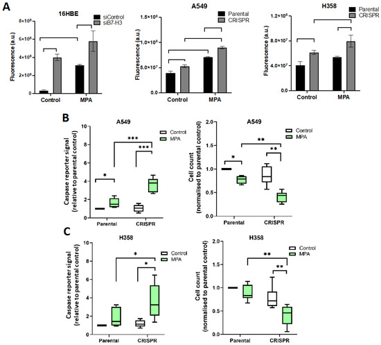 A549 and H358 parental and B7-H3 knockdown cells were used in this experiment in different conditions, cells were either untreated, MPA-treated, or starved for 48 h, and each condition was supplemented with 5 µM of either DMSO as the vehicle control or Cisplatin to trigger cell apoptosis. After 48 h, growth media were removed, and CellEventTM Caspase-3/7 Green Detection Reagent (ThermoFisher) was added to wells at 0.4 µM together with DAPI for 30 min as per the manufacturer’s protocol. Cells were then imaged using the GFP and DAPI channels via an EVOS microscope. The fluorescence was measured, and the number of cells was counted, both using Fiji software (v4).