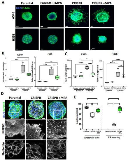 To test this in more physiologically relevant conditions, we generated spheroids of control of B7-H3-depleted A549 and H358 cells, embedded them in collagen I hydrogels and assessed proliferation and spheroid expansion after 24 h of culture. The quantification of the resulting confocal images (Figure 7A) revealed a significant increase in expansion of A549 and H358 B7-H3 CRISPR cell spheroids compared to parental controls, with increased apparent invasion as evidenced by single cells detaching from the spheroid mass (Figure 7A,B). This increased spheroid expansion was also accompanied by increased growth of B7-H3-depleted cells within the spheroid compared to parental controls (Figure 7C). The incubation of spheroids with MPA resulted in a significant reduction in both expansion and proliferation in B7-H3 knockdown cells with reduced free invading cells at the spheroid periphery, with no effect on control cells (Figure 7A–C), suggesting that IMPDH positively regulates these phenotypes in the absence of B7-H3. Images of spheroids stained for F-actin revealed a loss of cell–cell adhesion integrity at the periphery of B7-H3 CRISPR cells and an apparent release of invasive cells, suggesting that a loss of B7-H3 promotes cell–cell junction destabilisation and enhances cell–ECM adhesion to support the observed phenotypes (Figure S8A,B).