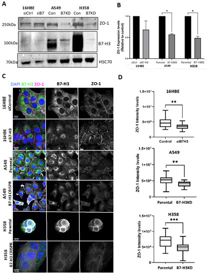 B7-H3 knockdown reduces ZO-1 levels and localisation to tight junctions. (A) Western blot of ZO-1 levels in lysates from 16HBE, A549, and H358 control, as well as B7-H3KD cells, probed for ZO-1, B7-H3, and HSC70 (loading control). (B) Quantification of data, as in (A), from n = 4 experiments. (C) Representative confocal images of siRNA control/parental or B7-H3 siRNA/CRISPR cells fixed and stained for nuclei (blue), ZO-1 (magenta), and B7-H3 (green). (D) Quantification of fluorescence intensity of ZO-1 from images, as in (C). Intensity is shown for at least 50 cells per cell line and 10 fields of view from 3 independent experiments. Data are shown as mean ± SEM; significance was assessed via t-test or one-way ANOVA; * p < 0.05, ** = p < 0.01, *** = p < 0.001. Scale bar: 10 µm. The uncropped bolts are shown in Figure S9.