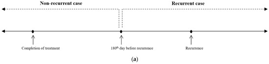 With data splitting of the recurrent cases, which had no recurrence within 180 days after the end of the treatment, 117 non-recurrent cases were newly created (Figure 1). Resultantly, 206 recurrent cases and 689 non-recurrent cases were included in the split training dataset.