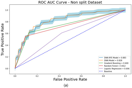 Performances of AI models from the original and split datasets: (a) The RFE algorithm is applied to the DNN model in the original (non-split) training dataset, and the top three features (PLR mean, PLR Tx, and PLR max–min) were selected. With these three features, the ROC-AUC and the PR-AUC values of the DNN-RFE model were 0.884 ± 0.032 and 0.788 ± 0.032, respectively, in the original training dataset; (b) the DNN-RFE algorithm is applied in a split training dataset, and the PLR R, PLR R-Tx, PLR mean, PLR Tx, and PLR max–min were selected. With the top five features, the ROC-AUC and the PR-AUC values of the DNN-RFE model were 0.889 ± 0.032 and 0.771 ± 0.044, respectively, in the split training dataset. When these top five features were used in the original training dataset, the ROC-AUC was 0.883 ± 0.027 (Table 3(a)).