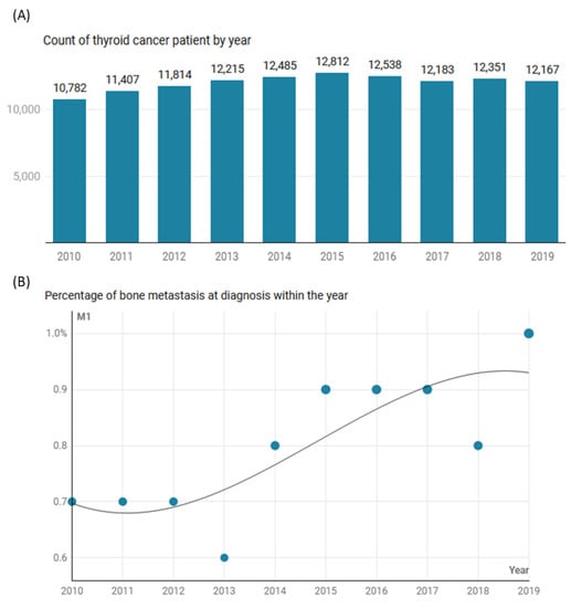 Thyroid cancer (TC) is a neoplasm that originates from the follicular cells of the thyroid gland, representing the most prevalent endocrine malignancy. In recent decades, there has been a significant global increase in the incidence of TC, making it the fastest-growing cancer type in both men and women []. Despite this growth in incidence, TC generally has a favorable prognosis, with an overall five-year survival rate exceeding 98% []. Impressive prognosis can be attributed to active surveillance and management of TC patients, but the recent literature has shed light on the fact that survival rates drop significantly in the context of distant metastases, with the bone being one of the most prevalent sites []. Bone metastases are a noteworthy complication of TC, significantly impacting patient outcomes and overall quality of life. Identifying the risk factors and clinical implications of bone metastases is crucial for optimizing patient management and enhancing therapeutic strategies [].