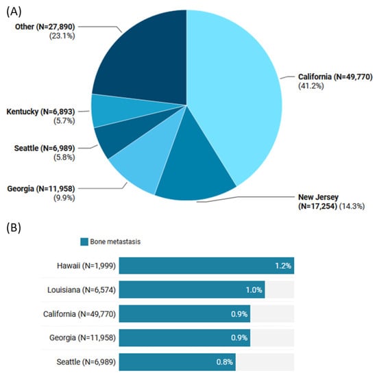 The geographical distribution of TC cases across the US states was predominantly in California (41.2%), followed by New Jersey (14.3%), Georgia (9.9%), and Seattle (58%). However, the highest proportion of bone metastases detected at diagnosis was found in Hawaii (1.2% out of 1999 patients) and Louisiana (1% of 6574 patients) (Figure 2).