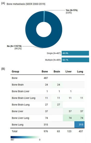 Of the 976 (0.8%) who presented with bone metastases, 489 (51.3%) had concomitant metastases in other organs. These included 63 cases with brain metastases, 123 with liver metastases, and 437 with lung metastases (Figure 3).
