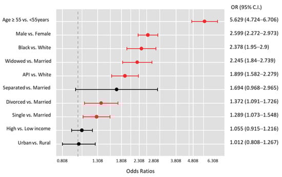 Multivariate analysis of patient characteristics with and without bone metastases at the time of diagnosis revealed that patients with bone metastases were more likely to be males (OR = 2.60, 95%CI = 2.27–2.97, p < 0.001), older than 55 years (OR = 5.63, 95%CI = 4.72–6.71, p < 0.001), Black (OR = 2.38, 95%CI = 1.95–2.9, p < 0.001) or Asian or Pacific Islander (OR = 1.90, 95%CI = 1.58–2.27, p < 0.001), and less likely to be married (all p < 0.05) (Figure 4).