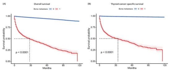 Survival analysis. (A) Kaplan–Meier survival curve for overall survival. (B) Kaplan–Meier survival curve for thyroid cancer-specific survival. The log-rank test was used to compare patients with and without bone metastasis.