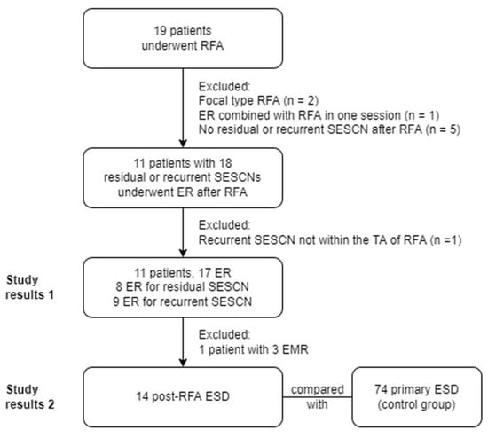 Chicago/Turabian StyleTsou, Yung-Kuan, Chi-Ju Yeh, Puo-Hsien Le, Bo-Huan Chen, and Cheng-Hui Lin. 2023. "Endoscopic Resection of Residual or Recurrent Lesions after Circumferential Radiofrequency Ablation for Flat Superficial Esophageal Squamous Cell Neoplasias" Cancers 15, no. 14: 3558. https://doi.org/10.3390/cancers15143558