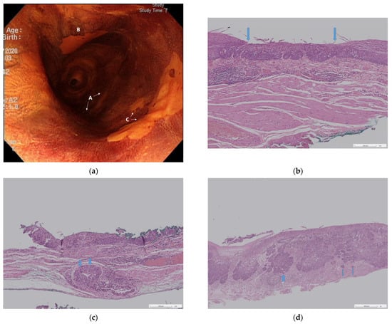 - Tajima, Y.; Nakanishi, Y.; Tachimori, Y.; Kato, H.; Watanabe, H.; Yamaguchi, H.; Yoshimura, K.; Kusano, M.; Shimoda, T. Significance of involvement by squamous cell carcinoma of the ducts of esophageal submucosal glands. Analysis of 201 surgically resected superficial squamous cell carcinomas. Cancer 2000, 89, 248–254. [Google Scholar] [CrossRef] [PubMed]