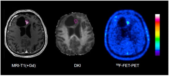 - Pyka, T.; Hiob, D.; Preibisch, C.; Gempt, J.; Wiestler, B.; Schlegel, J.; Straube, C.; Zimmer, C. Diagnosis of glioma recurrence using multiparametric dynamic 18F-fluoroethyl-tyrosine PET-MRI. Eur. J. Radiol. 2018, 103, 32–37. [Google Scholar] [CrossRef]