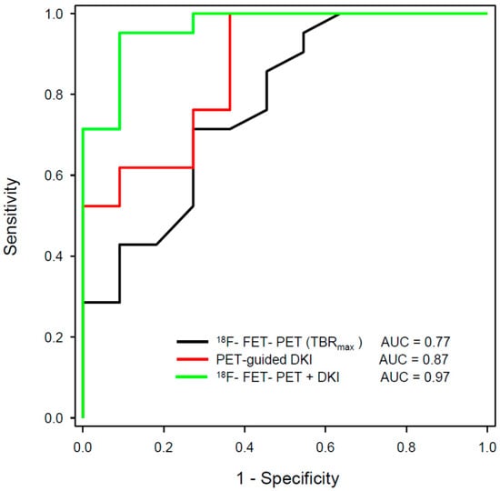 ROC analysis for differentiation between the tumour progression and treatment-related changes in gliomas using hybrid PET/MRI with 18F-FET PET and diffusion kurtosis imaging (DKI) from a previous publication of our group [109]. The largest area under the curve (AUC) could be achieved by the combination of 18F-FET PET and 18F-FET PET-guided DKI (green line).