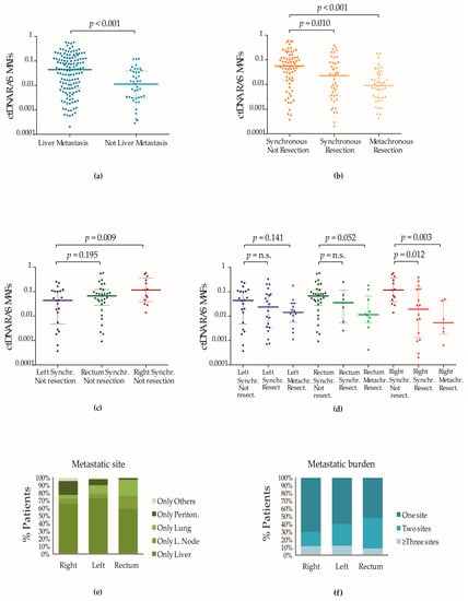 Impact of the mCRC clinicopathological characteristics on the detection of plasmatic RAS mutations. (a) Impact of the metastatic site on the plasmatic RAS MAFs. Dark blue dots (column 1) represent ctDNA RAS MAFs of patients with at least one liver metastasis. Light blue dots (column 2) represent ctDNA RAS MAFs of patients with at least one metastatic site at other anatomical locations than the liver. Lines represent the median and the 25–75% IQR. (b) Impact of surgical treatment and palliative/life-extending systemic chemotherapy on the ctDNA RAS MAFs. Plasmatic RAS mutations were detected in 113 patients with synchronous metastases and chemotherapy-naive and in 43 patients with metachronous metastases who had been at least previously treated by tumour surgery. Dark orange dots (column 1) represent ctDNA RAS MAFs of 69 patients with newly diagnosed synchronous mCRC who had not received surgical treatment. Light orange dots (column 2) represent ctDNA RAS MAFs of patients with synchronous metastases treated with resection of the primary tumour (4 had also been subjected to the removal of metastatic tissue). Yellow dots represent (column 3) ctDNA RAS MAFs of 43 patients with metachronous metastases; 34 had only been treated with resection of the primary tumour and 9 had been treated with resection of primary and metastatic tumour tissue. Adjuvant systemic chemotherapy had been administered to 24 of the cases before plasma collection. Lines represent the median and the 25–75% IQR. (c) Plasmatic RAS MAFs in patients with synchronous mCRC and different origins of the primary tumour who were not subjected to previous tumour surgery or systemic chemotherapy. Blue, green and red dots represent ctDNA RAS MAFs of patients with mCRC that originated in the left colon, rectum and right colon, respectively. Lines represent the median and the 25–75% IQR. (d) Plasmatic RAS MAFs from patients with primary tumours in different locations and treated with surgical resection. Blue, green and red dots represent ctDNA RAS MAFs of patients with mCRC that originated in the left colon, rectum and right colon, respectively. Colour gradients were used to show the decrease in the RAS MAFs in the mCRC subpopulations treated with resection of the primary tumour. Lines represent the median and the 25–75% IQR. (e) Correlation of primary tumour location with the metastatic pattern of mCRC. Plots showed the number of metastatic sites (e) and the anatomical location of the metastases (f) in 242 patients with synchronous tumours. All patients were naive to surgery or chemotherapy. The frequency of only one single site of metastasis was higher in patients with primary tumours located in the right colon. The liver was the predominant site of metastasis in mCRC with left colon origin, whereas lung metastases were more frequent in mCRC originating at the rectum. Peritoneal metastases and metastases to other sites were frequent in right-sided mCRC. Non-parametric Mann–Whitney U and Kruskal–Wallis tests were used to calculate p-values when two or more groups were compared.