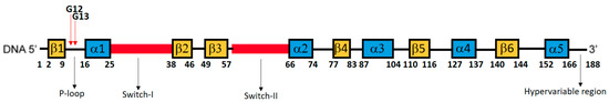 Schematic representation of amino acid positions, secondary structural elements, and functional elements of KRAS protein. The P-loop region (9–16), specifically positions 12 and 13, is the most common hotspot for mutations in KRAS gene, and it is essential for binding and hydrolyzing GTP. Switch 1 controls the conformational changes required for KRAS interaction with downstream effectors. Switch 2 plays a role in regulators and effectors binding. The hypervariable region is involved in membrane anchoring and localization of KRAS to specific cellular compartments. The GTP binding pocket is a complex structure formed through the interaction of amino acids from different regions (10–18, 57–63, 116–119, 143–146).