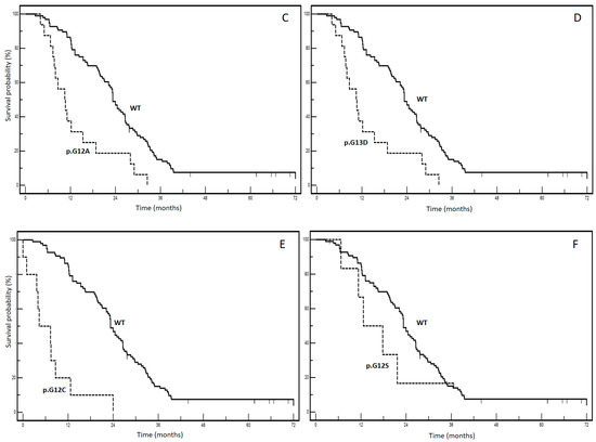 Kaplan–Meier survival curves according to different KRAS mutations ((A): WT vs. KRAS p.G12D; (B): WT vs. KRAS p.G12V; (C): WT vs. KRAS p. G13D; (D): WT vs. KRAS p.G13A; (E): WT vs. KRAS p.G12C; (F): WT vs. KRAS p.G13S). WT: wild-type KRAS patients.