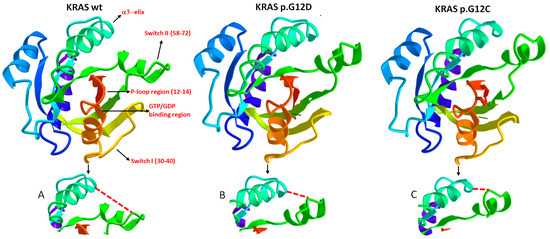 Notably, KRAS hot spot mutations predominantly occur in codons 12 and 13. Mutations in codons 61 and 146, although oncogenic, account for less than 5% of total KRAS mutations [5,6]. The most significant consequence of alterations in codons 12 and 13 is the allosteric distortion of the GDP/GTP binding pocket, which leads to the abolition of or reduction in GTPase activity in KRAS following guanine nucleotide activating protein (GAP) binding. Additionally, this alteration causes the molecule to remain locked in an active, GTP-bound state. It is important to note that codons 12 and 13 in the KRAS wild type encode glycine residues. When other amino acids are substituted at these positions (e.g., aspartate and valine at codon 12, and aspartate at codon 13), bulky amino acid side chains protrude into the GDP/GTP binding pocket of KRAS, hindering the steric hindrance in GTP hydrolysis [15]. Nonetheless, the functional implications diverge significantly, particularly concerning the interaction interface with effector proteins. This disparity not only exists between the wt and mutant variants but also among different mutant forms. Intriguingly, among the various KRAS mutants, p.G12D, which is the most prevalent in cancer, exhibits the closest resemblance to the wt in terms of its dynamics [16]. These findings strongly suggest and validate that an alteration in KRAS dynamics follows an allosteric mechanism, and a mutation can induce diverse modifications in the protein, even in distal regions. Hence, structural variations in mutated forms of KRAS arise from allosteric effects on the protein, resulting in spatial distortions within regions involved in binding effectors and GAPs. These GAPs regulate GTP hydrolysis and facilitate the transition of KRAS into its inactive GDP-bound state [17]. As a result, these modifications in the three-dimensional structure of KRAS lead to differences in its ability to interact with effector and regulatory molecules. Figure 3 provides a comparative representation of the structures of the KRAS wt, KRAS p.G12D and p.G12C, demonstrating their distinct spatial conformations in specific regions.