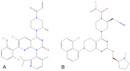 Chemical structures of sorotasib (A) and adagrasib (B).