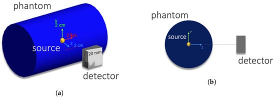 The simulated setup was composed of a solid cylinder phantom made of air or soft tissue (both defined in GEANT4 material database) with a 30 mm radius and a 100 mm height, and a Compton camera with two adjacent CZT crystal layers each with dimensions of 20 × 20 × 5 mm and a 5.78 g cm density. The phantom radius was chosen by approximating a mouse model [7]. The detector was situated in the Z-axis as shown in Figure 2. The distance between the detector and the gamma source (yellow mark) in the figure can be varied.