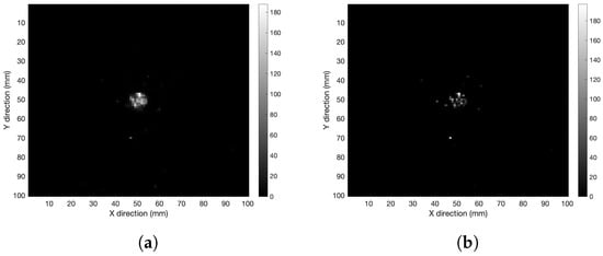 In order to check the performance of the iterative algorithm, 250 iterations were carried out in air with the detector 60 mm away from the source. The spherical volume was reconstructed as shown in Figure 3. When the iteration number is as high as 250, the algorithm develops a sort of granularity in the XY-image (see Figure 3b). It was found that 50 iterations were enough to obtain an image with acceptable resolution according to the algorithm convergence and avoid the granularity issue.