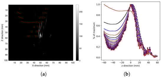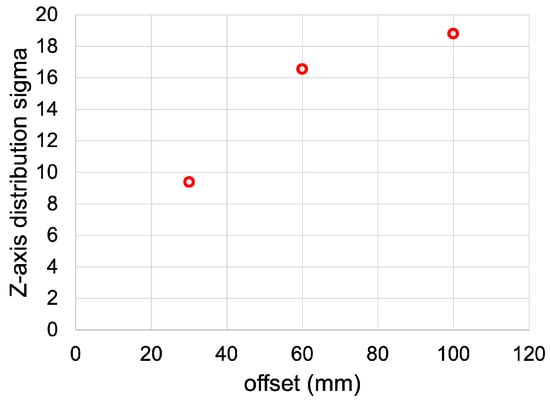 Previous studies have already demonstrated that this stretching effect arises at larger Compton scattering angles () [19]. Then, to investigate the stretching behavior, measurements with the detector at distance values in the range from 30 to 100 mm were performed. The Z-axis profiles after 250 iterations were fitted with Gaussian distributions. Figure 7 shows the fitted sigmas vs. the detector distance values; therefore, longer stretching is associated with larger distances.