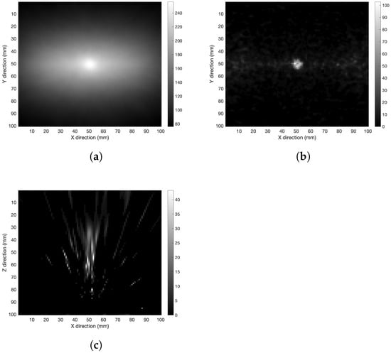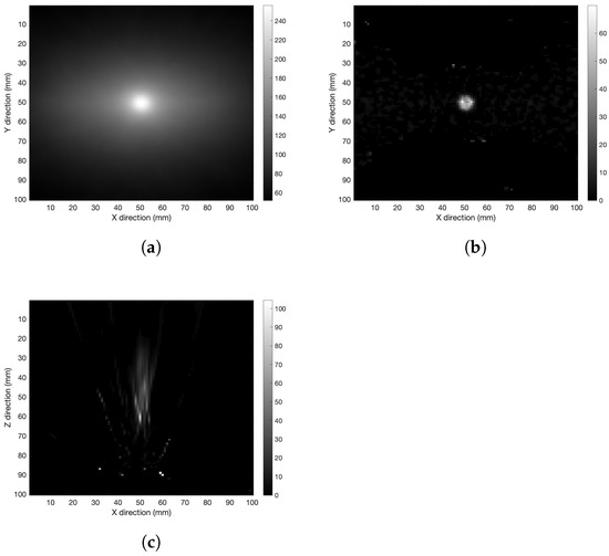 Spherical source with therapeutic ratio T/N = 2.0 and detector distance 60 mm. (a) XY-plane back-projection, (b) XY-plane tomography with 50 iterations, and (c) XZ-plane tomography with 250 iterations.