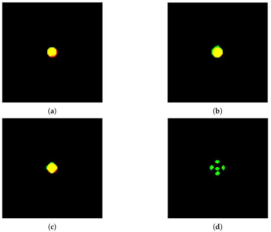 The four configurations were segmented using between two and three cycles of erosion and dilation, each depending on the geometric shape of the source and the boron concentration ratio present. The real source images overlapped with the reconstructed images are shown in Figure 10. The regions in yellow represent the intersection between the real source and the reconstructed one (true positive); the red regions represent the image portions belonging only to the real source (false negative); and the green regions represent the reconstructed region only (false positive).
