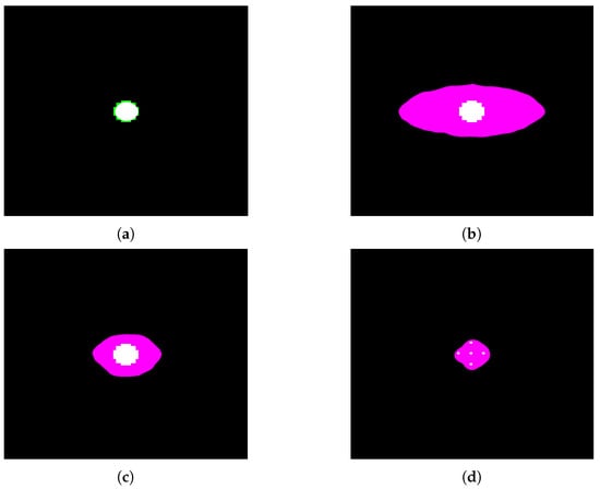 Segmentation using CNN: (a) case 1, (b) case 2, (c) case 3, and (d) case 4. Green regions: real source, pink: pixels classified by the network, and white: overlapping region.