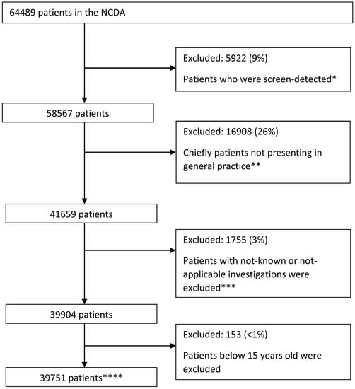 - Swann, R.; McPhail, S.; Shand, B.; Rashbass, J.; Witt, J.; Abel, G.A.; Hiom, S.; Lyratzopoulos, G.; Rubin, G. Diagnosing cancer in primary care: Results from the National Cancer Diagnosis Audit. Br. J. Gen. Pract. 2018, 68, e63–e72. [Google Scholar] [CrossRef]
