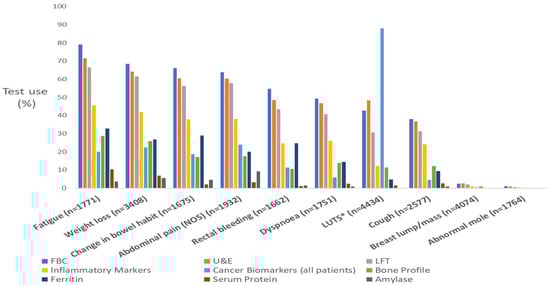 Proportion of patients having each of the 9 blood tests studied after presenting with the 10 most frequently reported symptoms. * Lower urinary tract symptoms; cancer biomarker use by LUTs is restricted to men (88%). Symptoms presented in descending order by FBC use.