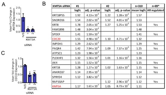 KMT5A-regulated genes in LNCaP-AI cells. (A) LNCaP-AI cells reverse-transfected with 25 nM siRNA targeting KMT5A or a non-silencing control (N/S) in steroid-depleted media. After 72 h, 10 nM DHT was added to the cells for a further 24 h. RNA was isolated, quality-checked, and its gene expression profiles determined using Illumina HT-12 v4.0 Expression BeadChip Microarray. Three independent experimental repeats were performed. Data analysis confirmed successful KMT5A knockdown. (B) Table of genes ranked for their down-regulation in response to KMT5A knockdown in the presence of DHT stimulation. Genes which were down-regulated more than KMT5A are shown (full gene lists can be found in the Supplementary Information). *GSE211638 [23]. (C) CDC20 expression levels in response to KMT5A knockdown as determined via microarray analysis. One-way ANOVA with Dunnett’s multiple comparisons test. * p < 0.05; ** p < 0.01.