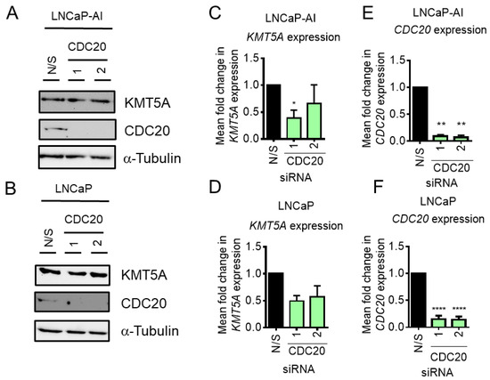 CDC20 knockdown does not affect KMT5A protein levels. (A) LNCaP-AI cells and (B) LNCaP cells reverse-transfected with 25 nM siRNA targeting CDC20 or a non-silencing control (N/S) for 72 h prior to analysis via Western blot analysis. Alpha-tubulin was used as a loading control. (C) LNCaP-AI and (D) LNCaP cells reverse-transfected with 25 nM siRNA targeting CDC20 or a non-silencing control (N/S) for 72 h prior to RNA isolation and qPCR analysis for KMT5A and (E,F) CDC20 mRNA levels. HPRT1 was used as a housekeeping gene. Data are expressed as mean fold change +/− SEM. One-way ANOVA was used to determine statistical significance. * p < 0.05; ** p < 0.01; **** p < 0.0001. The uncropped blots are shown in File S1.