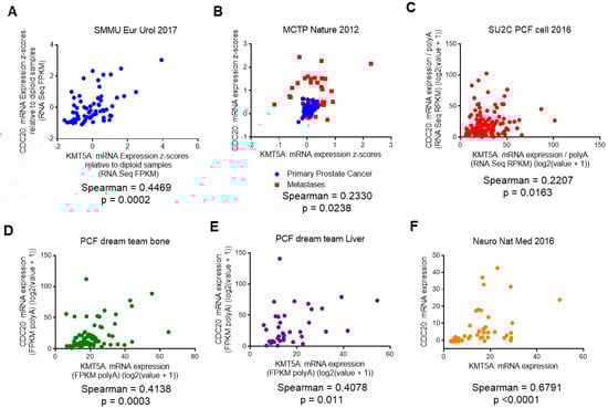 To confirm whether or not our in vitro findings could be translated into clinical specimens of prostate cancer, we interrogated publicly available datasets to confirm a positive correlation between CDC20 and KMT5A transcripts. Upon the interrogation of data sets available in cBioportal [31,32], we found a significant positive correlation between KMT5A and CDC20 transcripts in a number of data sets. In a cohort of 65 treatment-naïve radical prostatectomies [33] a positive correlation between CDC20 and KMT5A transcripts was observed (Spearman = 0.45; p = 0.0002) (Figure 4A). Similarly, in the MCTP dataset [34], a positive correlation was also observed (Spearman = 0.23; p = 0.024) (Figure 4B). However, this dataset contains samples from primary (blue) and metastatic prostate cancer (red). Upon the correlation analysis of these individual sample types, it was observed that the correlation between CDC20 and KMT5A was strongest in the primary prostate samples (Spearman = 0.28; p = 0.033; n = 59) and no statistically significant correlation was observed in the metastatic samples (Spearman = 0.034; p = 0.85; n = 35), although the sample numbers were lower. However, in the metastatic cohort reported by Robinson et al. [35] a statistically significant correlation was observed between CDC20 and KMT5A (Spearman = 0.22; p = 0.016; n = 118) (Figure 4C). Furthermore, significant correlations were observed in bone metastases (Spearman = 0.41; p = 0.0003; n = 72) (Figure 4D) and liver metastases (Spearman = 0.408; p = 0.011; n = 38) (Figure 4E) in the samples from Abida et al. [36]. Interestingly, the highest positive correlation between CDC20 and KMT5A expression was seen in prostate neuroendocrine carcinoma samples (Spearman = 0.68; p < 0.0001; n = 49) (Figure 4F) [37]. Taken together, this suggests that the positive correlation between KMT5A and CDC20 observed in our cell line models is also observed in advanced prostate cancer.