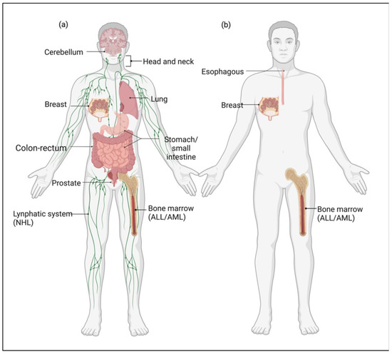 MRN gene mutations in cancer. Organs and tissues where NBS1 (a) and RAD50 (b) heterozygous germline mutations increase cancer risk. The figure was created with Biorender.com.