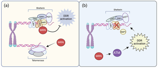 Many DDR proteins, particularly those involved in responding to DNA DSBs, physically associate with telomeres and play key roles in their maintenance. In fact, components of the DDR are necessary both for normal telomere homeostasis and for responding to dysfunctional telomeres (Figure 3) [107]. The MRN complex associates with human telomeres through interaction with TRF2 and it is required for the activation of ATM at dysfunctional telomeres [108,109]. Moreover, the MRN complex participates in the formation of the structure of t-loops, the lariats formed through the strand invasion of the telomere terminus into the duplex telomeric DNA, which contributes to telomere protection, and consequently to the preservation of genome stability, by effectively shielding the chromosome ends from DNA damage response factors that interact with DNA ends [107,109]. Telomeres of telomerase-negative primary cells recruit MRE11, phosphorylated NBS1, and ATM in every G2 phase of the cell cycle, when telomeres are unprotected and accessible to modifying enzymes. Degradation of the MRN complex, as well as inhibition of ATM, led to telomere dysfunction. Therefore, a localized MRN complex-dependent DDR at telomeres after replication is essential for recruiting the processing machinery that promotes the formation of a chromosome end protection complex [110], avoiding chromosome instability and senescence.