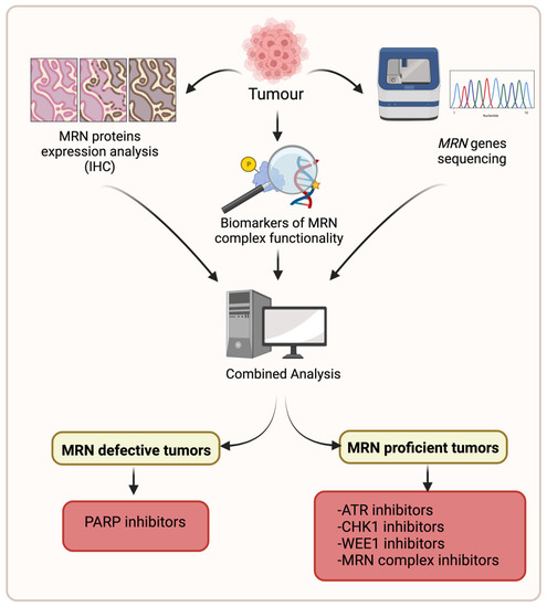 How to use MRN complex expression/functionality as predictive marker in cancer. We believe that a big part of the conflicting studies on the role of the MRN complex in prognosis depends on the fact that they do not distinguish between MRN defective and proficient tumors. To overcome this limit, we propose to introduce a new medical practice in which genetic, biochemical, and in silico analyses of the MRN complex are combined to predict the best therapeutic choice in prospective studies. It is expected that MRN-defective tumors may result in sensitivity to PARP inhibitors, while MRN overexpressing tumors may be effectively treated with drugs targeting the RSR. The figure was created with Biorender.com.