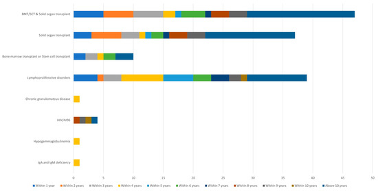 Years from onset of immunosuppression to diagnosis of melanoma. Bar graph representation of time to onset of melanoma from initial diagnosis of a condition leading to patient’s immunosuppression status. Abbreviations: BMT/SCT, bone marrow transplant/stem cell transplant.