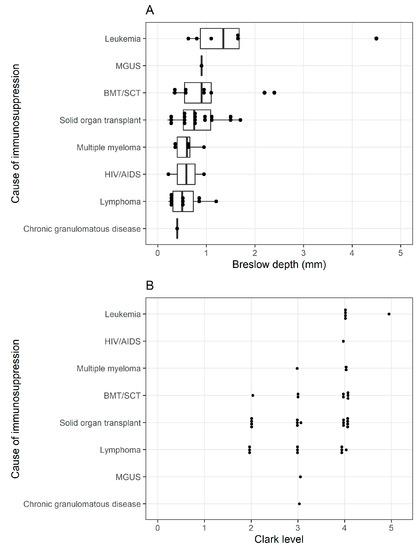 Histopathologic data. (A): Dot plot of Breslow depth of melanoma lesions by cause of immunosuppression. Abbreviations: BMT/SCT, bone marrow transplant/stem cell transplant; MGUS, monoclonal gammopathy of undetermined significance. (B): Dot plot of Clark level of melanoma lesions by cause of immunosuppression. Abbreviations: BMT/SCT, bone marrow transplant/stem cell transplant; MGUS, monoclonal gammopathy of undetermined significance.