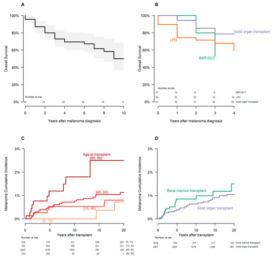 Survival analysis. (A): Kaplan–Meier all-cause survival curve of all patients following melanoma diagnosis. The pooled trend is indicated by the solid line, while the 95% confidence interval is indicated by the accompanying gray shading (upper and lower bound). (B): Kaplan–Meier all-cause survival curves for immunosuppressive subcategories with n ≥ 10 patients (bone marrow or stem cell transplants, lymphoproliferative disorders, and solid organ transplant). Abbreviations: BMT/SCT, bone marrow transplant/stem cell transplant; LPD, lymphoproliferative disorder. (C): Cumulative melanoma incidences for institutional transplant database patients, subdivided by the age of the patient at transplant. Age categories include [0, 15), [15, 40), [40, 65), and [65, 80]. (D): Cumulative melanoma incidences for institutional transplant database patients, subdivided by transplant category. Transplant categories include solid organ and bone marrow transplantation.