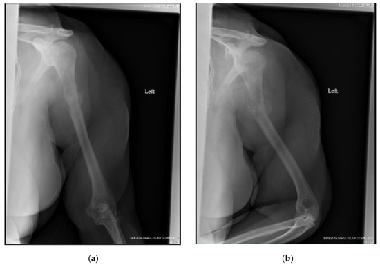 - Sarahrudi, K.; Wolf, H.; Funovics, P.; Pajenda, G.; Hausmann, J.T.; Vécsei, V. Surgical Treatment of Pathological Fractures of the Shaft of the Humerus. J. Trauma Inj. Infect. Crit. Care 2009, 66, 789–794. [Google Scholar] [CrossRef]