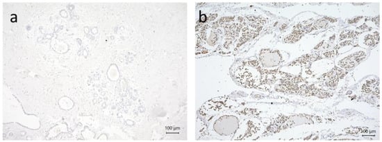 Immuno-histochemical staining serving as a negative (a) or positive control; (b) TRα struma. All pictures are 10× lens (scale bar = 100 µm) magnification.