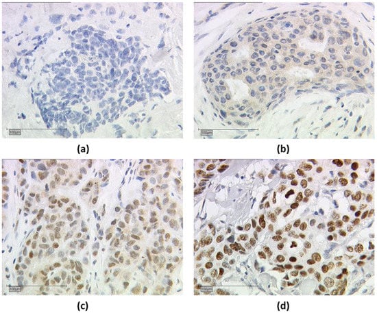 Immuno-histochemical staining of thyroid hormone receptor alpha 2 (TRα2). Immuno-histochemical staining of TRα2 in human breast cancer samples is illustrated in (a–d): (a) negative cytoplasmic and nuclear TRα2 expression, (b) positive cytoplasmic and negative nuclear TRα2 expression, (c) positive nuclear and cytoplasmic TRα2 expression, and (d) positive nuclear and negative cytoplasmic TRα2 expression; (a–d) shows a 25× (scale bar = 100 µm) magnification.