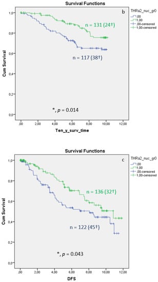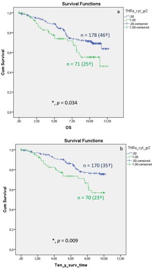 Cytoplasmic expression of TRα in BC tissue was associated with significantly lower OS and ten-year survival rate, as well as tendential lower DFS, whereas nuclear expression of TRα revealed a tendential association with improved OS. In a multivariate analysis, cytoplasmic TRα is considered to be an independent negative prognostic factor of OS when adjusted to fit clinico-pathological parameters. TRα1 had no prognostic relevance, whereas nuclear TRα2 expression in BC tissue was associated with significantly longer OS, ten-year survival, and DFS. Additionally, a multivariate analysis identified nuclear TRα2 expression as an independent positive prognosticator of OS when adjusted to fit clinico-pathological parameters.