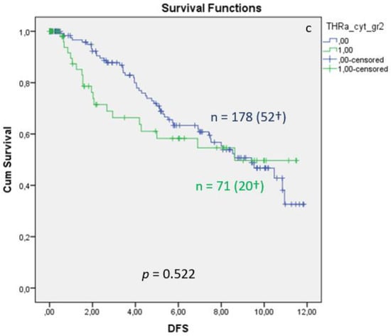 Newer investigation showed that TRα1 acts as a new squamous-cell lung cancer diagnostic marker and poor prognosis predictor [62]. In addition, the TRα1 was the only receptor in a previous study of our group, showing a significant effect on unifocal BC. The Kaplan–Meier curve illustrated a worse DFS for unifocal BC patients when expressing the TRα1 [42]. In the whole cohort, cytoplasmic expression of TRα1 showed a trend of favorable survival (see Supplementary Figures), albeit without reaching significance. The same observation can be defined for nuclear expression of TRα1.