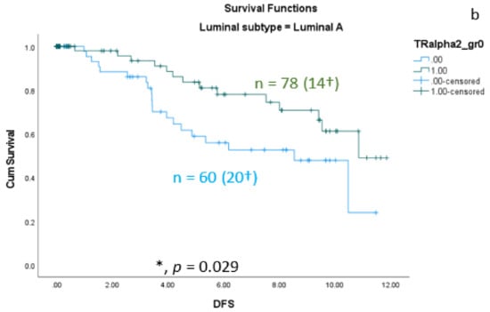 Kaplan–Meier survival analyses of nuclear TRα2-positive and TRα2-negative expression in relation to overall survival (OS) (a) in the group of breast cancer patients with Ki67 expression greater than 14% and disease-free survival (DFS) (b) in the group of Luminal A patients. Data are shown as years in the X-axes and the cumulative survival rate (Cum Survival) in the Y-axes. n corresponds to the number of patients in each group, and the number in brackets (†) corresponds to the number of deceased patients or patients with a recurrence event for DFS in each group, asterisk (*) corresponds to significant differences (p < 0.05).