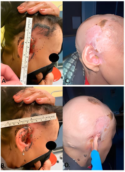 (A,B) patient number 2 photographed before starting treatment with Sonidegib 200 mg daily. (C,D) the same patient after 1 year of therapy. The complete remission of the locally advanced BCC was histologically confirmed, and Sonidegib was discontinued.