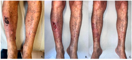 Pictures of patient number 11 of this case series. (A–C) respectively represents T0 (before treatment), T1 (1 month), and T3 (3 months).