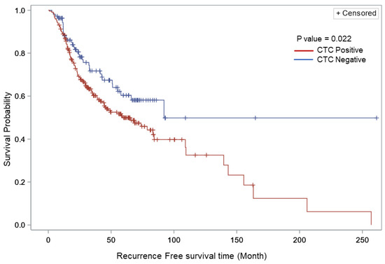Univariate logistic regression analysis of the overall cohort (Table 4) was performed to assess the correlation between covariates and relapse within the overall cohort (n = 325). Patients who were CTC-negative were significantly less likely to develop disease relapse compared to those who were CTC-positive (OR: 0.48, 95% CI: 0.30–0.78, p-value < 0.006). The presence of at least 1 CTC was associated with significantly increased risk of disease relapse (OR: 2.07, 95% CI: 1.28–3.35, p-value < 0.003). Kaplan–Meier survival analysis showed that the presence of CTCs was significantly associated with decreased relapse-free survival (p = 0.022, log-rank test, Figure 2). Univariate cox regression analysis (Table 5) was performed to evaluate time to recurrence for CTC presence (positive/negative) in the overall cohort. The analysis showed that CTC-negative patients had a lower risk of relapse than CTC-positive patients (HR: 0.37, 95% CI: 0.26–0.53, p-value < 0.001). In Table 6, multivariate cox regression analysis using CTC as a time-dependent covariate showed that patients with a higher number of lymph nodes containing metastases had increased risk of relapse compared to patients with one positive lymph node, and the hazard ratios increased along with the number of nodes (HR: 1.64 and 2.68 of 2–3 LN and >3 LN, p < 0.001). Similarly, the hazard ratios for relapse increased concomitantly with the number of CTCs detected (p < 0.001).