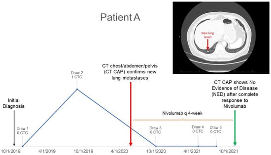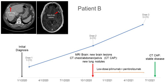 In our current study, we demonstrated that CTCs could, in many cases, be identified many months prior to the confirmed radiologic detection of disease relapse. To further highlight this finding, we provide example cases where CTCs detected months prior to positive imaging were shown to correlate with prognostic outcomes. In Figure 3, we show Patient A who had one CTC detected approximately 8 months prior to CT scans of chest/abdomen/pelvis showing lung metastases. Patient A proceeds to achieve CTC clearance, as indicated by their subsequent results of zero CTCs. This CTC clearance was confirmed to correspond with the patient’s clinical outcome—no evidence of disease (NED) due to complete response to immunotherapy. Figure 4 illustrates Patient B’s CTC results which begin with a positive CTC result of one approximately 8 months prior to the MRI detection of a new brain lesion and CT detection of new pulmonary nodules. Subsequent blood draws for Patient B resulted in increasing numbers of CTCs, which corresponded with further progression and poor prognosis. While these are only select examples, they highlight the potential future clinical utility for early intervention or changes in systemic therapy to attempt to head off the establishment of distant metastasis.