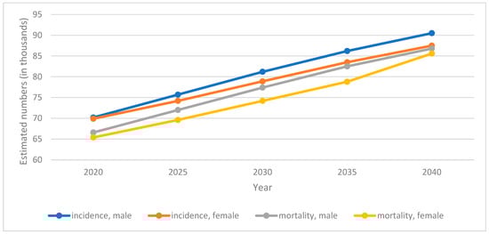 Predictions show that the number of cases of pancreatic cancer will increase. By 2025, it is estimated that the number of new cases will increase by 9829, and by 2040 by 37,824, which will give 177,940 cases. Mortality will increase to 141,653 deaths in 2025, and to 169,389 in 2040 (37,255 more deaths than in 2020) (Figure 2). In the breakdown by sex, the predominance of men was observed for both indicators.