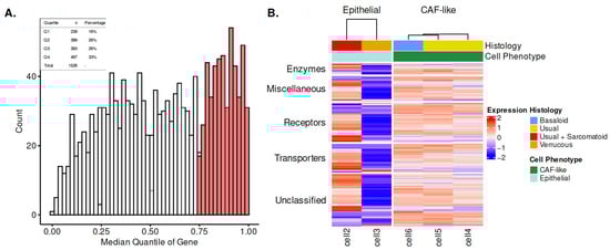This approach resulted in 497 genes that were used as the ‘expressed’ PSCC cell line surfaceome (Supplemental Table S3). A heatmap demonstrates the expression levels of these surfaceome genes and their associated functional protein classes defined by Almén et al. [] in each cell line (Figure 1B). When evaluating the epithelial cell lines, clear differences were noted in the surfaceome composition of verrucous histology. The CAF-like cells demonstrated similar surfaceome expression patterns with each other, despite divergent origin histology, which also overlapped with epithelial cells. Table 1 demonstrates the breakdown of the functional classes within the expressed surfaceome, which identified that 25%, 18%, and 7% of targets were categorized as receptors, transporters, and enzymes, respectively. The breakdown of functional protein subclasses by expression quartiles is shown in Supplemental Table S4.