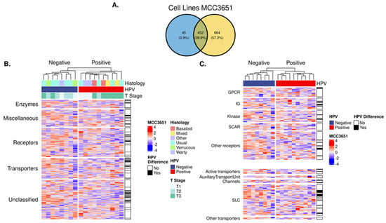 We also observed differences in the expression levels of functional protein classes between HPV-pos and HPV-neg tumors (shown as black lines in the vertical bar adjacent to heatmap). In this regard, 25%, 21%, and 15% of transporters, enzymes, and receptors, respectively, demonstrated differences according to the HPV status (Table 4).